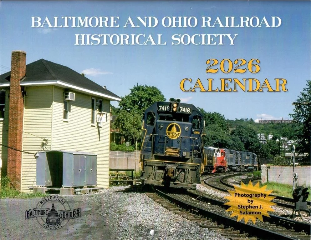 The B&ORHS 2026 calendar was available for purchase at the Company Store and at B&ORHS functions. This year's calendar contains 16 photos and captions from the history of the B&O Railroad, selected from the camera of Stephen J. Salamon. The calendar features color photos of locations over the B&O system in Maryland, Pennsylvania, and Ohio during the 1970s through the 1980s. The content is mostly diesel era, except for two steam images on the inside front and back covers.