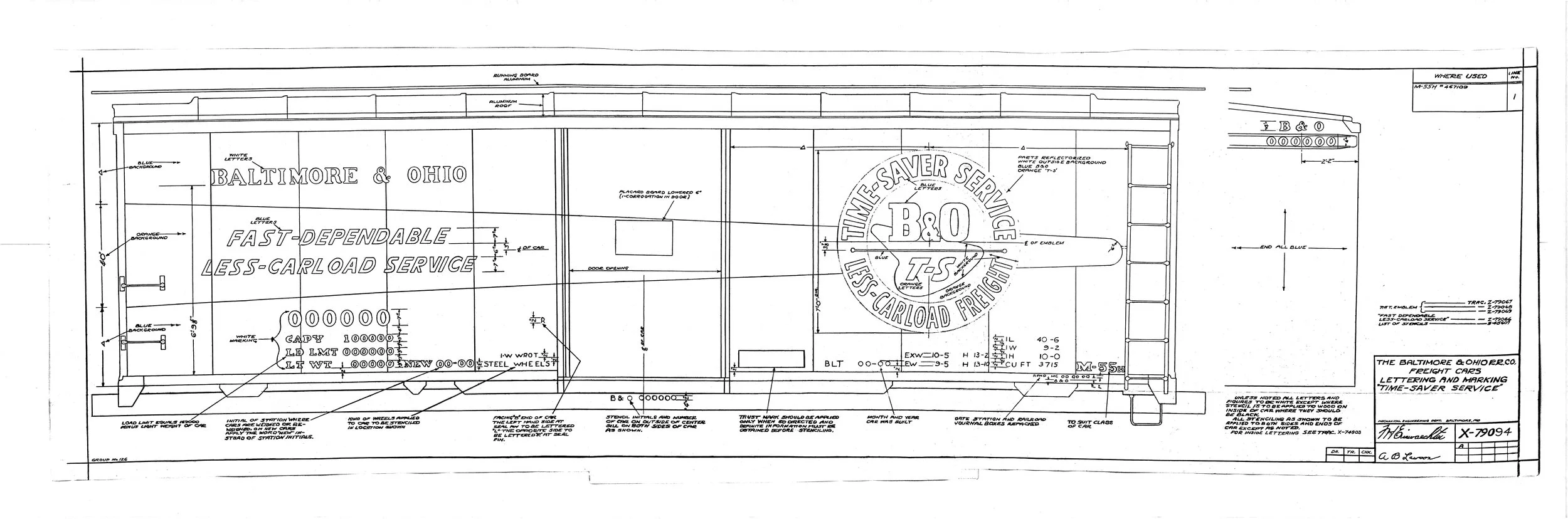This Drawing appears to be a master numbered X-790. Another drawing in our files (X-79094) shows the paint scheme for 467109, dated 7-27-1950, with an Aluminum painted roof. Other cars show a Blue roof (it appears 467109 had both silver and blue roofs).